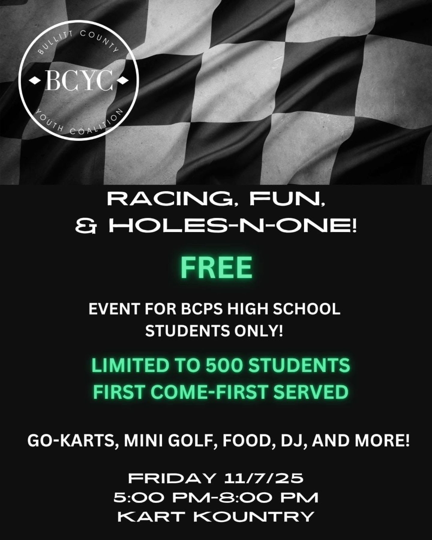 Bullitt County Youth Coalition is hosting an exciting FREE event exclusively for BCPS high school students! Join us for an evening of go-karts, mini golf, food, a DJ, and more—all at no cost.