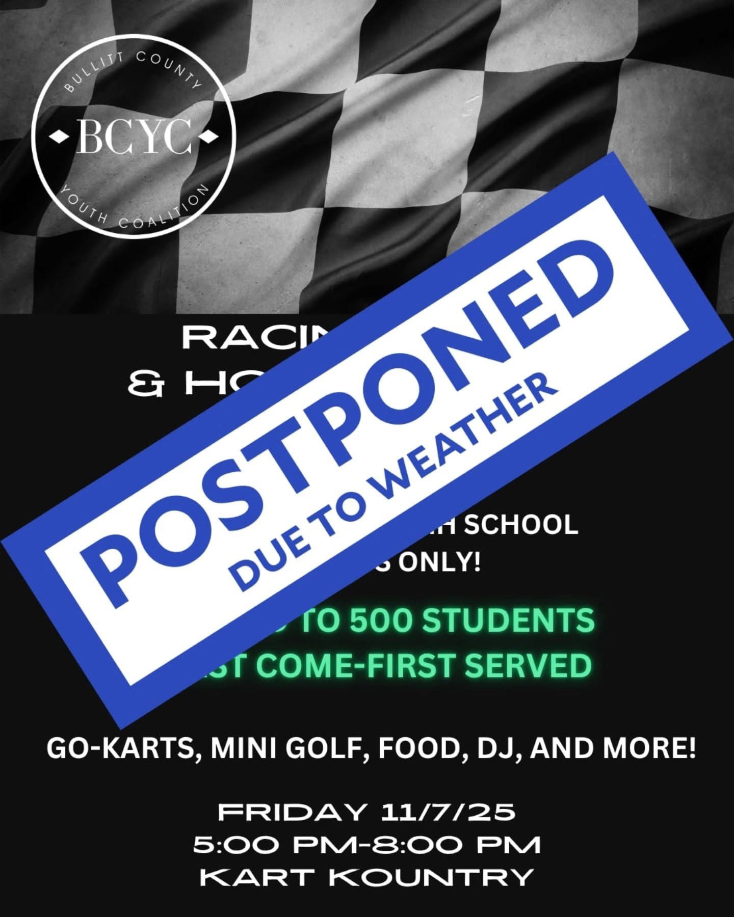 The Bullitt County Youth Coalition’s “Racing & Holiday Hangout” event scheduled for Friday, November 7th at Kart Kountry has been postponed due to weather.