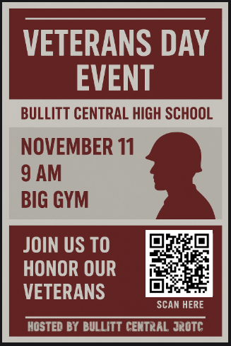 We also invite all veterans to join us for our Veteran’s Day Program on Monday, November 11th at 9:30 AM in the school auditorium. Your service will be celebrated and recognized by our entire Bullitt Central community. Light refreshments will be served following the program for all veterans.