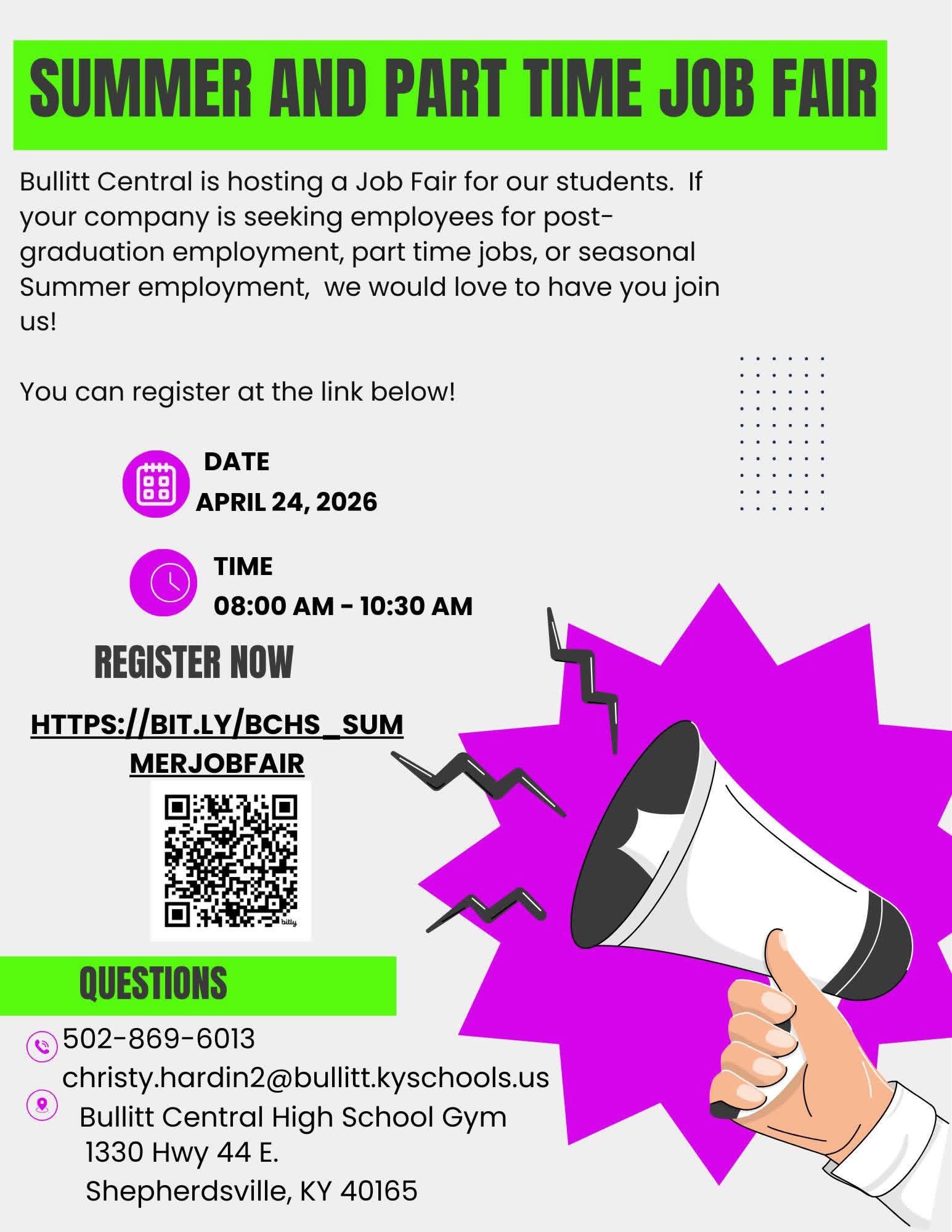 π https://bit.ly/BCHS_summerJobFair If you have any questions, please contact Christy Hardin at π§ christy.hardin2@bullitt.kyschools.us.