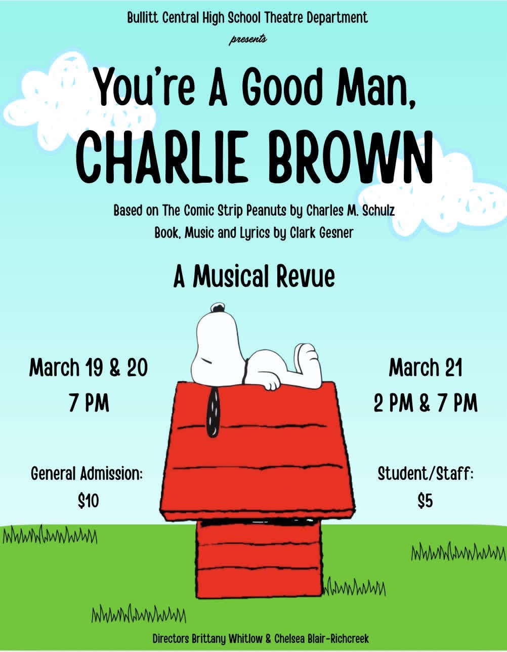 The Bullitt Central High School Theatre Department is excited to present its spring musical, Youβre a Good Man, Charlie Brown! Based on the beloved Peanuts comic strip by Charles M. Schulz, this heartwarming musical revue brings Charlie Brown, Snoopy, Lucy, Linus, and the rest of the gang to life through fun songs, humor, and classic moments audiences of all ages will love.