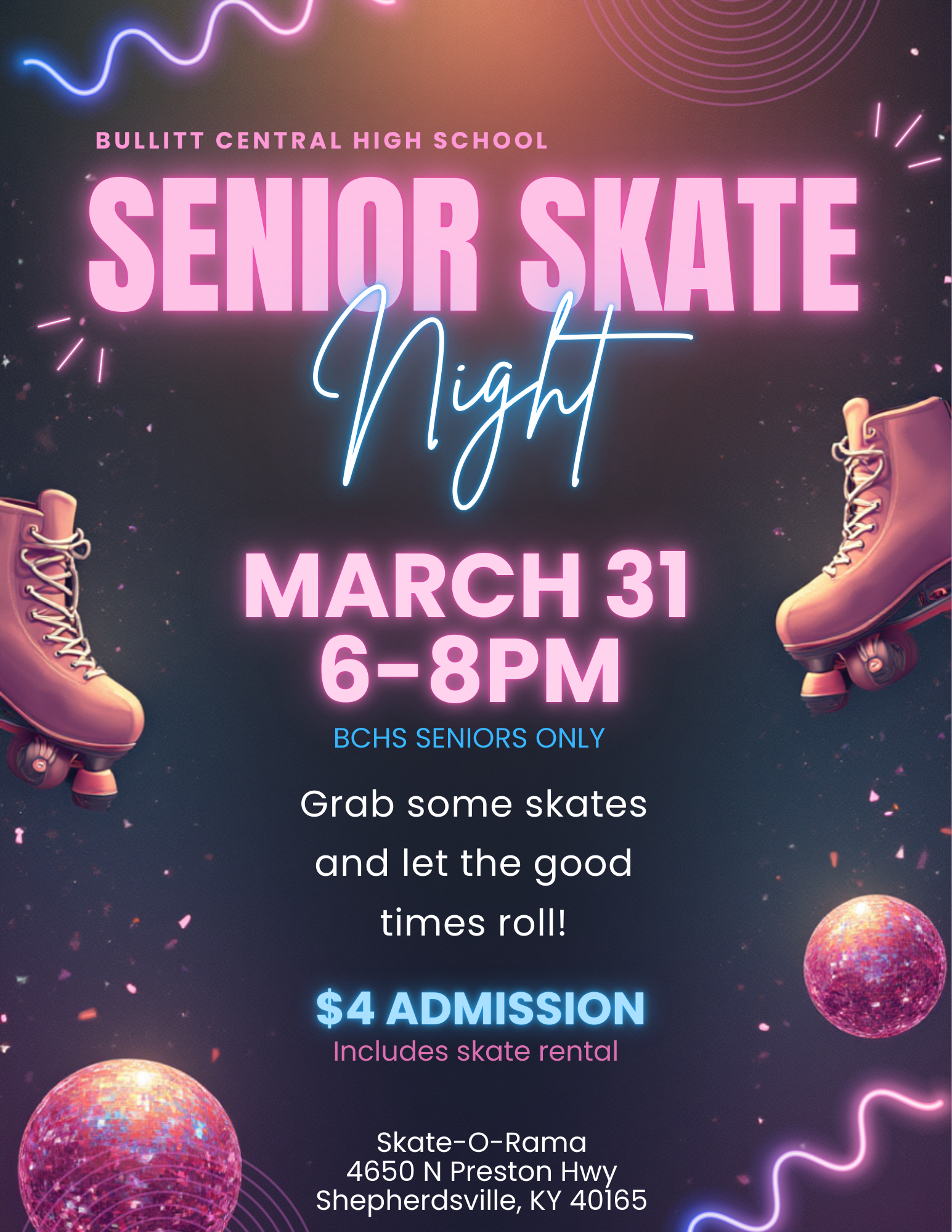 Our seniors are invited to celebrate together at Senior Skate Night on March 31 from 6β8 PM at Skate-O-Rama. This special event is for BCHS seniors only and is a great chance to relax, have fun with friends, and make more memories before graduation.