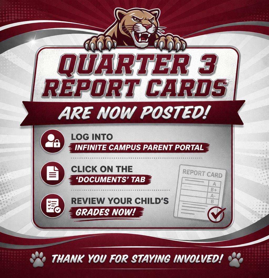 Quarter 3 report cards have been posted and are ready for review. Families can log into the Infinite Campus Parent Portal, click on the Documents tab, and view their childβs grades. Please take a few moments to review progress and reach out to teachers with any questions. |