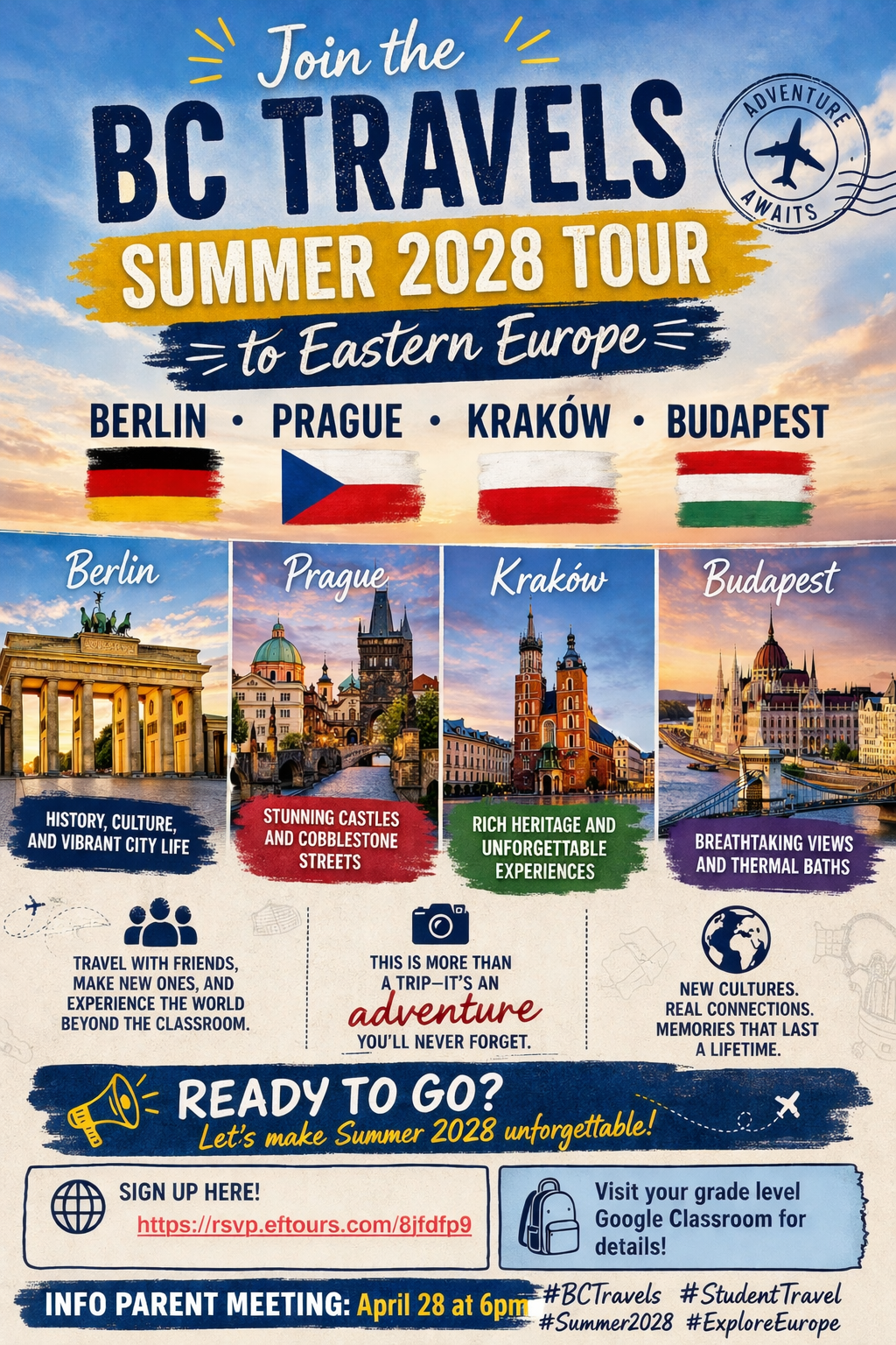 Students are invited to join an unforgettable international travel experience to Berlin, Prague, Kraków, and Budapest. This tour offers a blend of history, culture, and real-world learning—from exploring iconic landmarks 🏰 to experiencing vibrant city life and new cultures alongside friends.