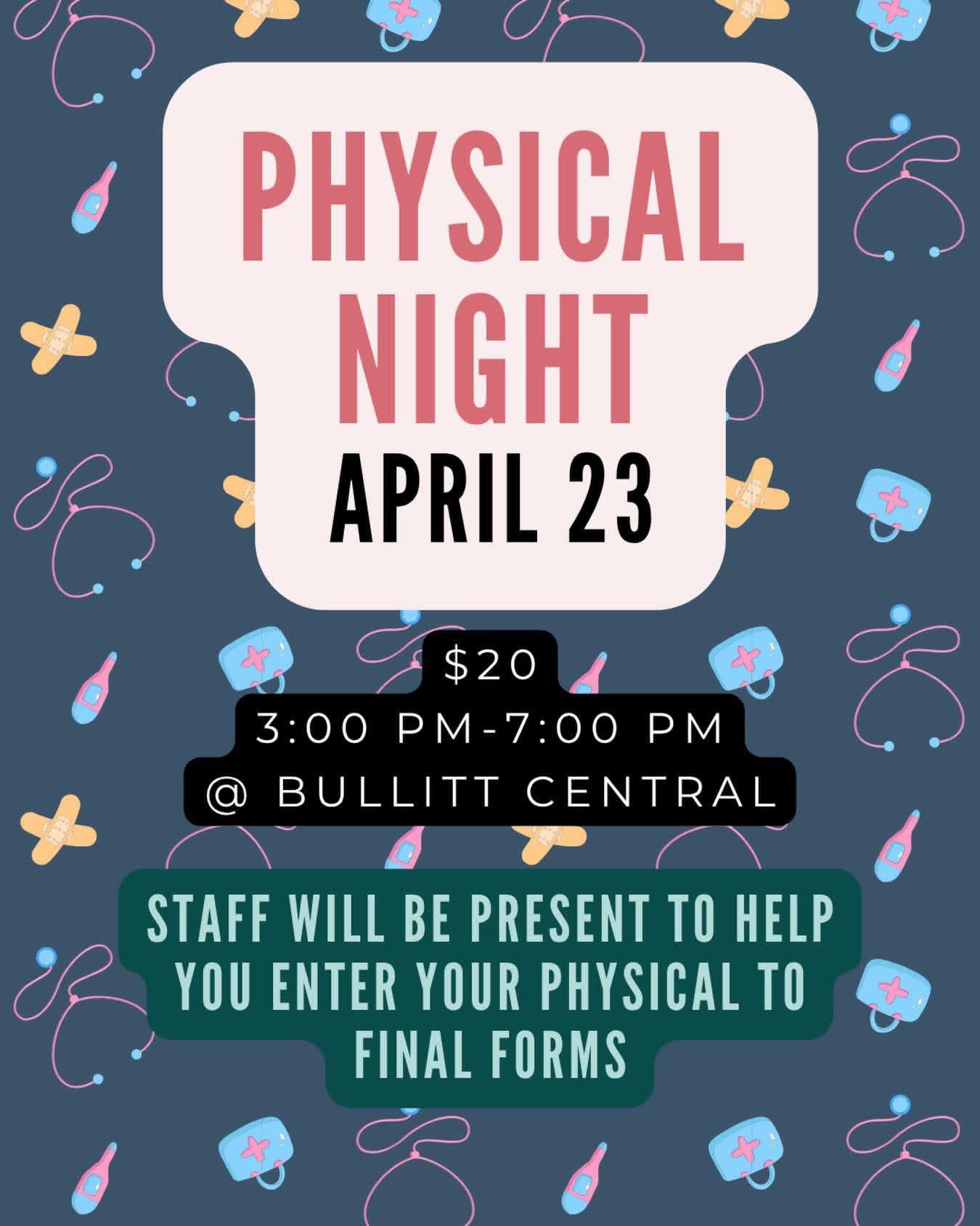 Students can complete their required physical on Wednesday, April 23rd from 3:00–7:00 PM at Bullitt Central, held in the College and Career Center. The cost is $20, and staff will be available to help families enter physical information into Final Forms.