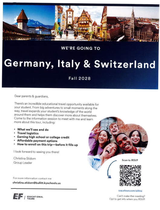 The hills are alive with the sound of...... travel with the Eastside Travel Club to Switzerland, Germany, & Italy over Fall Break 2028 and find out! There will be an informational meeting in the EMS library on March 5th at 6pm. Please use the attached QR code to RSVP to attend the meeting.