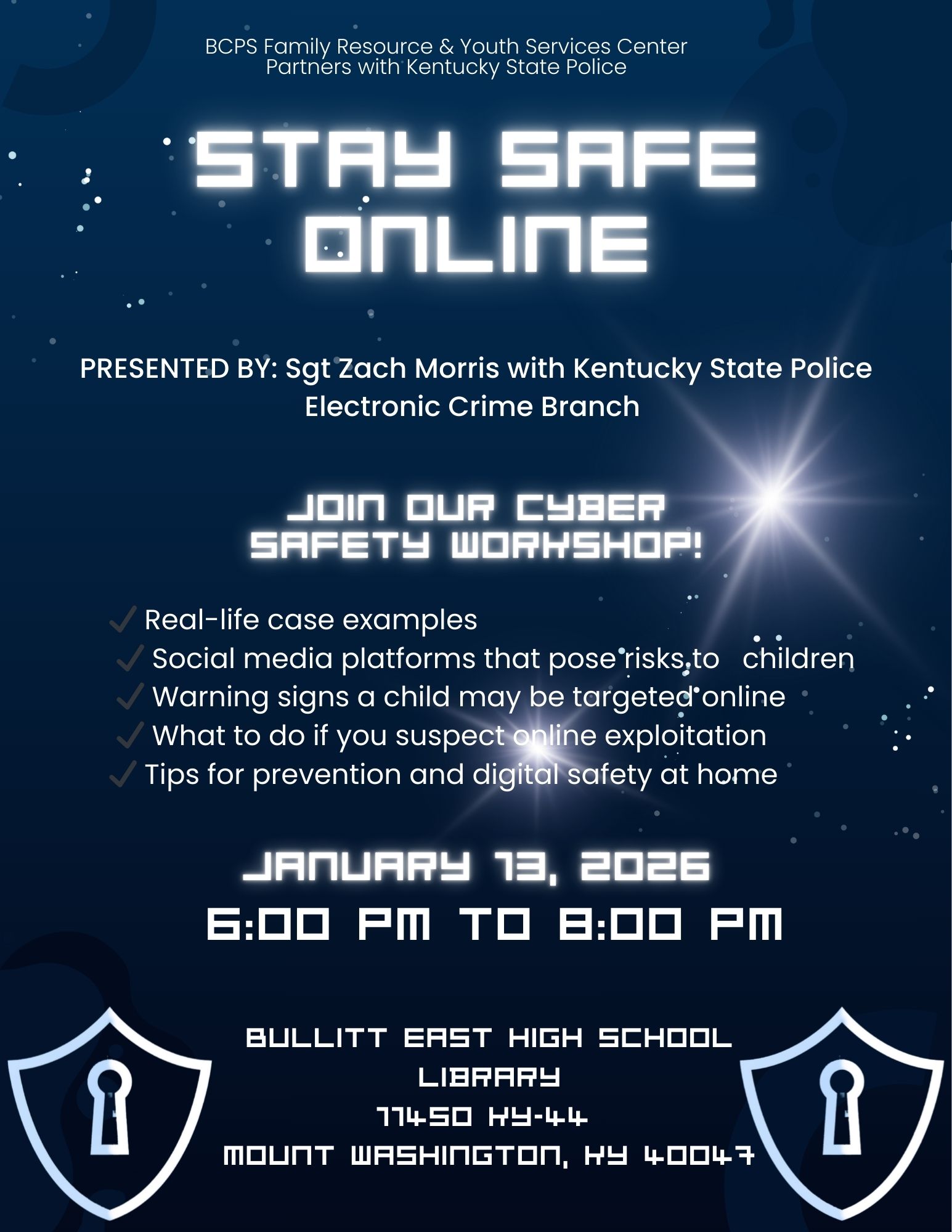 We hope 2026 is off to a great start. Looking ahead, tentatively on February 4th, our 8th graders will have the opportunity to take a field trip to the Career and Technical Education Center, a great chance to explore future career paths and imagine life beyond middle school. Also, Bullitt East will be hosting their annual 8th grade/incoming freshman parent night on Tuesday, February 10th, at 6:00 in the Bullitt East main gym.